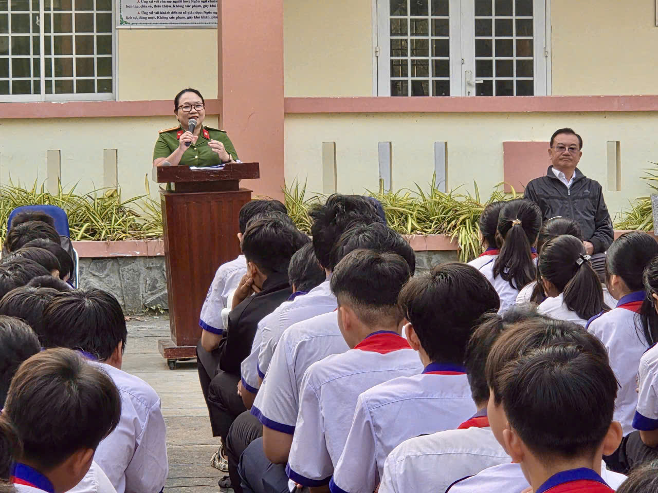 Đồng chí Trung tá Nguyễn Thị Nga, Cán bộ Tổ CSKV tuyên truyền pháp luật tại Trường Tiểu học và THCS Thạnh Đông A