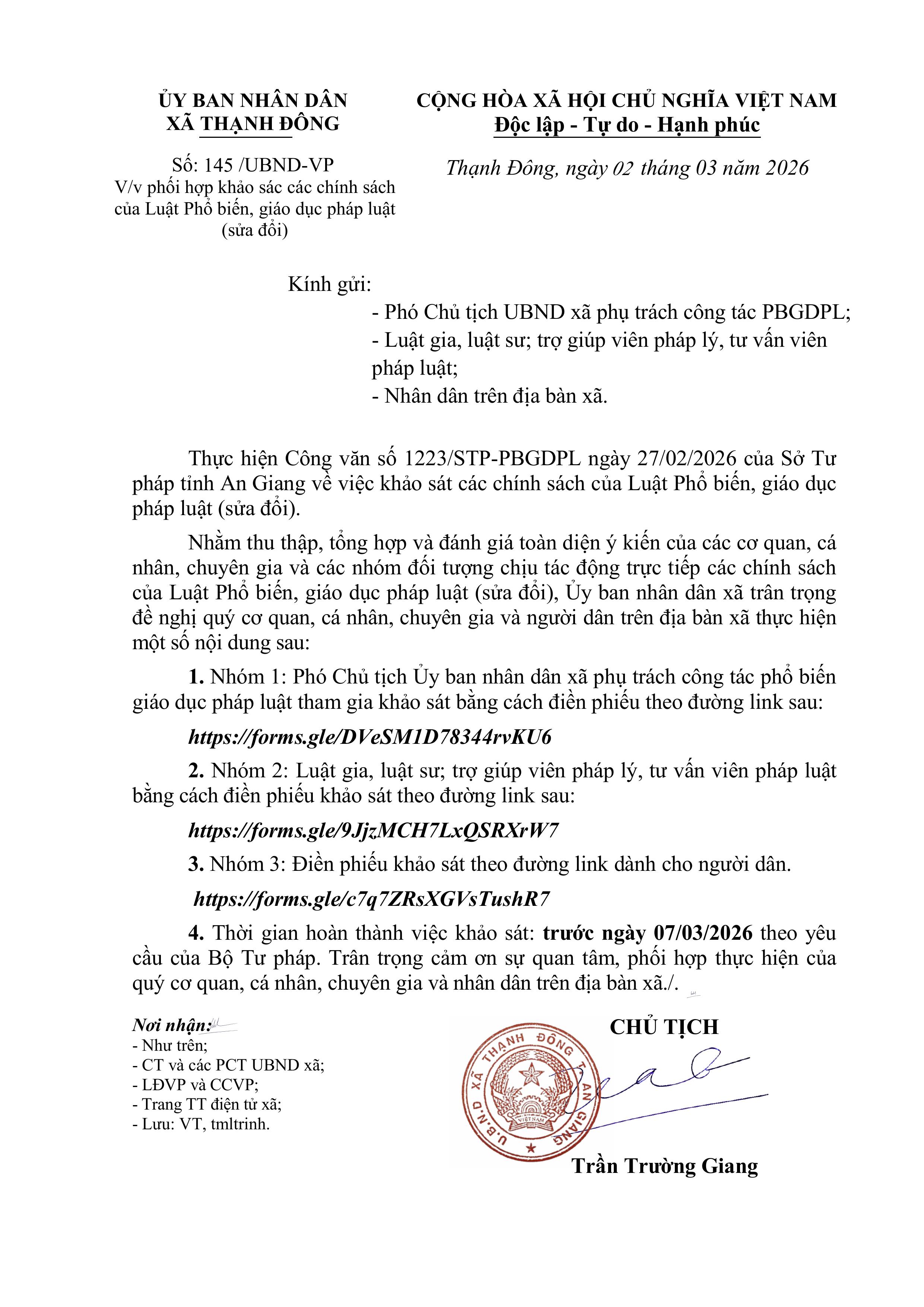 aA Tuyên truyền phổ biến pháp luật Công văn số 145/UBND-VP ngày 02 tháng 3 năm 2026 của UBND xã Thạnh Đông về việc phối hợp khảo sác các chính sách của Luật Phổ biến, giáo dục pháp luật (sửa đổi) 03/03/2026, 08:41 Quản lý nhuận bút Nhuận bút Quay về Chia sẻ Copy link thành công Tin khác Phổ biến tài liệu điện tử tuyên truyền cuộc bầu cử đại biểu Quốc hội khóa XVI và đại biểu Hội đồng nhân dân các cấp nhiệm kỳ 2026 - 2031 Tuyên truyền phổ biến pháp luật 12/02/2026 Về việc khảo sát phục vụ xây dựng, hoàn thiện thể chế, chính sách về hòa giải ở cơ sở Tuyên truyền phổ biến pháp luật 25/11/2025 Về việc thực hiện Nghị định số 285/2025/NĐ-CP ngày 03/11/2025 của Chính phủ bãi bỏ một số Nghị định của Chính phủ Tuyên truyền phổ biến pháp luật 20/11/2025 Về việc tổ chức các hoạt động hưởng ứng Ngày Pháp luật nước Cộng hòa xã hội chủ nghĩa Việt Nam Tuyên truyền phổ biến pháp luật 10/10/2025 Về việc triển khai thực hiện Quyết định số 27/2025/QĐ-TTg ngày 04/8/2025 của Thủ tướng Chính phủ và Thông tư số 15/2025/TT-BTP ngày 11/9/2025 của Bộ trưởng Bộ Tư pháp Tuyên truyền phổ biến pháp luật 30/09/2025 Về việc tiếp tục tuyên truyền, phổ biến các văn bản có liên quan đến Chỉ số cải thiện chất lượng quy định của pháp luật, Chỉ số chi phí tuân thủ pháp luật Tuyên truyền phổ biến pháp luật 30/09/2025 Về việc triển khai các văn bản về đổi mới công tác xây dựng và thi hành pháp luật đáp ứng yêu cầu phát triển đất nước trong kỷ nguyên mới Tuyên truyền phổ biến pháp luật 30/09/2025 Tăng cường đảm bảo an ninh trật tự trên biển Tuyên truyền phổ biến pháp luật 29/10/2018 Kết thúc Hành trình: “Tuổi trẻ cụm Sông Hậu vì biển, đảo quê hương” năm 2018 Tuyên truyền phổ biến pháp luật 11/06/2018 HƯỞNG ỨNG TUẦN LỄ BIỂN VÀ HẢI ĐẢO VIỆT NAM, NGÀY ĐẠI DƯƠNG THẾ GIỚI NĂM 2018 "Cùng chung tay giữ màu xanh của biển" Tuyên truyền phổ biến pháp luật 04/06/2018 /cong-van-so-145ubnd-vp-ngay-02-thang-3-nam-2026-cua-ubnd-xa-thanh-dong-ve-viec-phoi-hop-khao-sac-cac-chinh-sach-cua-luat-pho-bien-giao-duc-phap-luat