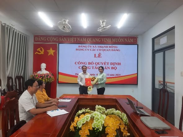 Ngày 05/12/2025, Đảng ủy Các cơ quan Đảng xã tổ chức Hội nghị công bố quyết định về công tác cán bộ. Tham dự và trao quyết định có đồng chí Huỳnh Thị Thanh Yến - Bí thư Đảng ủy các cơ quan Đảng, đồng chí: Võ Thị Thùy Trang - Phó Bí thư Đảng ủy các cơ quan Đảng.