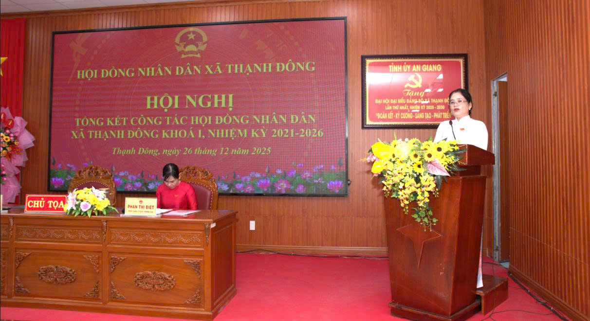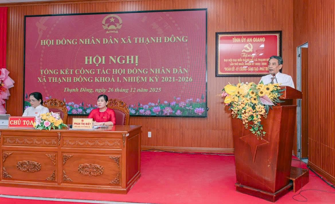 Chiều ngày 26/12/2025 vừa qua, Hội đồng nhân dân xã Thạnh Đông tổ chức hội nghị tổng kết hoạt động Hội đồng nhân dân (HĐND) xã khóa I, nhiệm kỳ 2021 – 2026. Tham dự hội nghị có Linh mục Phạm Thế Hòa – Chánh xứ Giáo xứ Hiệp Hòa, đại biểu HĐND tỉnh An Giang đơn vị số 19; Ông Lê Trường Kế, Bí thư Đảng ủy xã Thạnh Đông; Bà Huỳnh Thị Thanh Yến, Phó Bí thư Thường trực - Chủ tịch HĐND xã; Ông Trần Trường Giang, Phó Bí thư - Chủ tịch UBND xã; Bà Phan Thị Biết, UV. BTV Phó Chủ tịch HĐND xã, cùng các ông, bà Phó Chủ tịch Ủy ban nhân dân xã; lãnh đạo các Ban HĐND xã; đại diện các cơ quan, ban, ngành, các tổ chức chính trị - xã hội, các Trạm y tế trên địa bàn; Ban lãnh đạo các ấp, Ban Giám hiệu các điểm trường trên địa bàn xã và 80/85 đại biểu HĐND tham dự hội nghị.