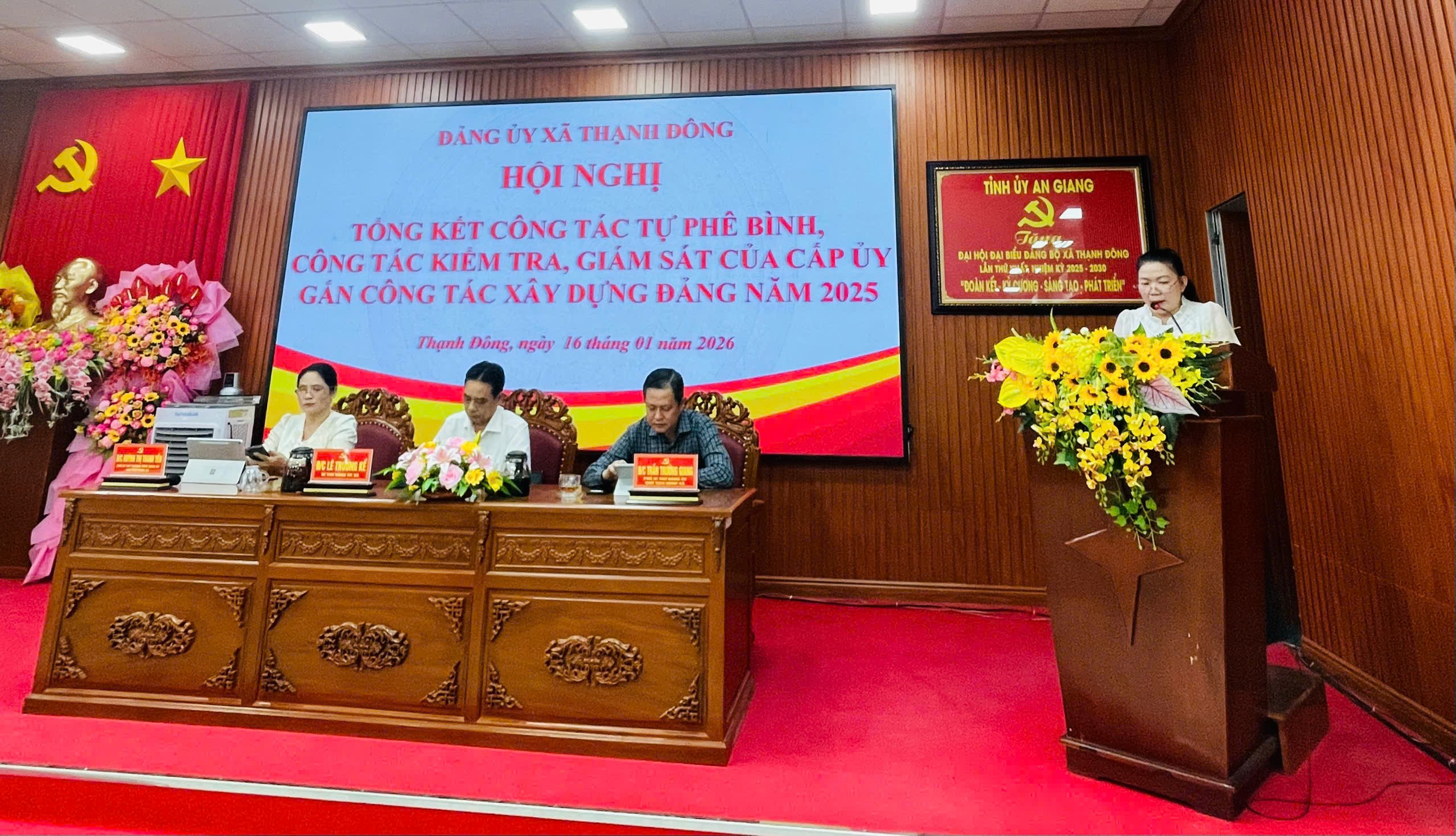 Ngày 16/01/2026, Ban Thường vụ Đảng ủy xã tổ chức Hội nghị Ban Chấp hành Đảng bộ xã (mở rộng) để tổng kết công tác kiểm điểm, đánh giá, xếp loại chất lượng tổ chức đảng, đảng viên và tập thể lãnh đạo quản lý năm 2025; đồng thời tổng kết công tác kiểm tra, giám sát của cấp ủy gắn với tổng kết công tác xây dựng Đảng năm 2025. Đến dự có đồng chí Nguyễn Tuyết Hạnh, Ủy viên Ủy ban Kiểm tra Tỉnh ủy thành viên Tổ Địa bàn IV theo dõi chỉ đạo xã Thạnh Đông. Đồng chí Lê Trường Kế, Bí Thư Đảng ủy cùng đồng chí Huỳnh Thị Thanh Yến, Phó Bí thư Thường trực Đảng ủy, Chủ tịch HĐND xã, đồng chí Trần Trường Giang, Phó Bí thư Đảng ủy, Chủ tịch UBND xã thay mặt Ban Thường vụ Đảng ủy chủ trì hội nghị. Tham dự hội nghị có các đồng chí Ủy viên Ban Chấp hành Đảng bộ xã; ủy viên Ủy ban Kiểm tra Đảng ủy; bí thư các chi, đảng bộ trực thuộc và trưởng các ban, ngành, Mặt trận tổ quốc các tổ chức đoàn thể chính trị - xã hội.