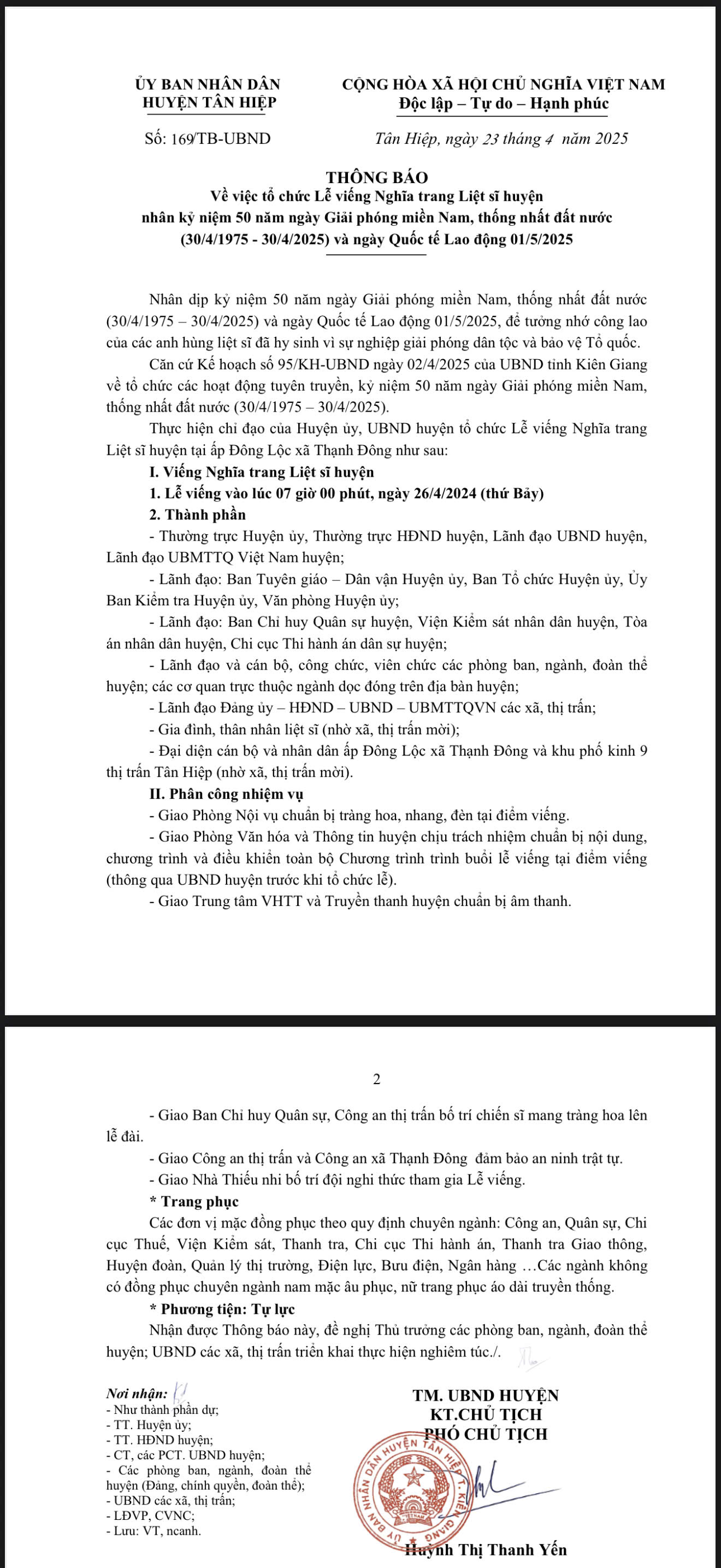 Về việc viếng nghĩa trang Liệt sỹ Huyện Tân Hiệp nhân kỷ niệm 50 năm ngày Giải phóng miền nam, thống nhất đất nước (30/4/1975 - 30/4/2025) và ngày Quốc tế Lao động (01/5/2025)