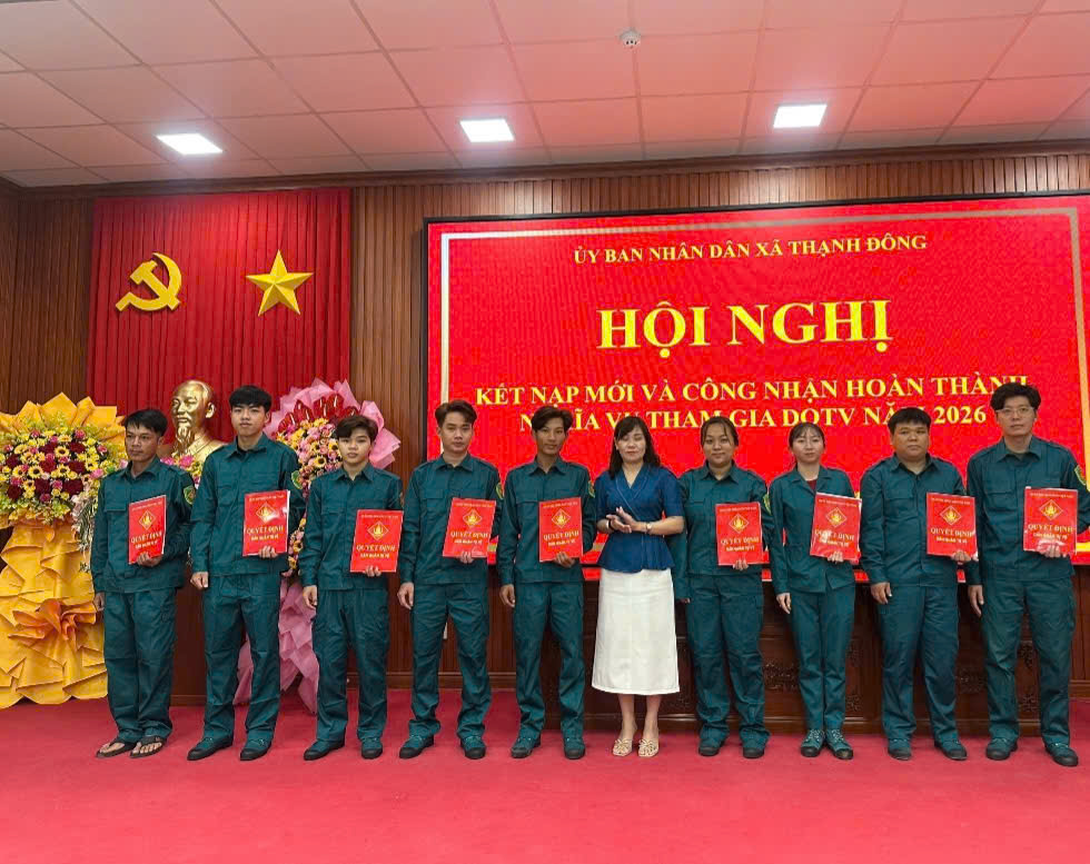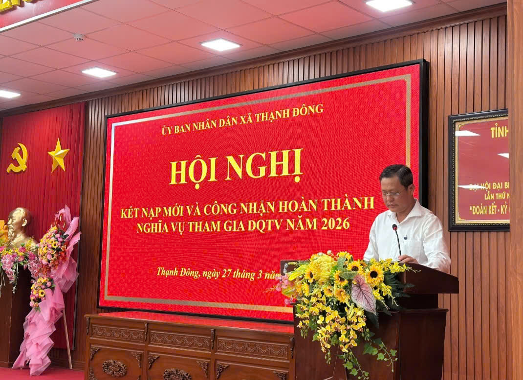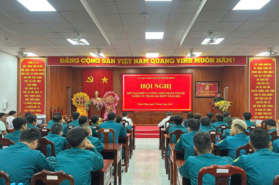 Sáng ngày 27/03/2026, UBND xã Thạnh Đông tổ chức Hội nghị kết nạp mới và công nhận hoàn thành nghĩa vụ tham gia Dân quân tự vệ năm 2026. Dự và Chỉ đạo hội nghị có đồng chí Lê Trường Kế, Bí thư Đảng ủy xã Thạnh Đông, Bí thư Chi bộ Quân sự xã; Chủ trì hội nghị Đồng chí Trần Trường Giang, Chủ tịch Ủy ban nhân dân xã, Chủ tịch Hội đồng nghĩa vụ Quân sự xã; tham dự còn có đại diện Ban Chỉ huy PTKV 6 - Ngọc Chúc, các đồng chí trong hội đồng nghĩa vụ Quân sự xã, trưởng các ấp trên địa bàn.