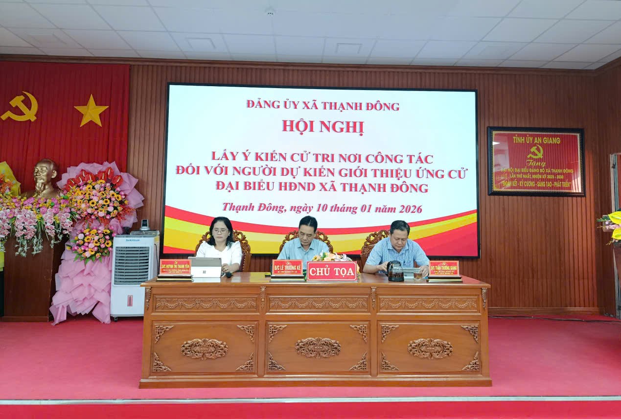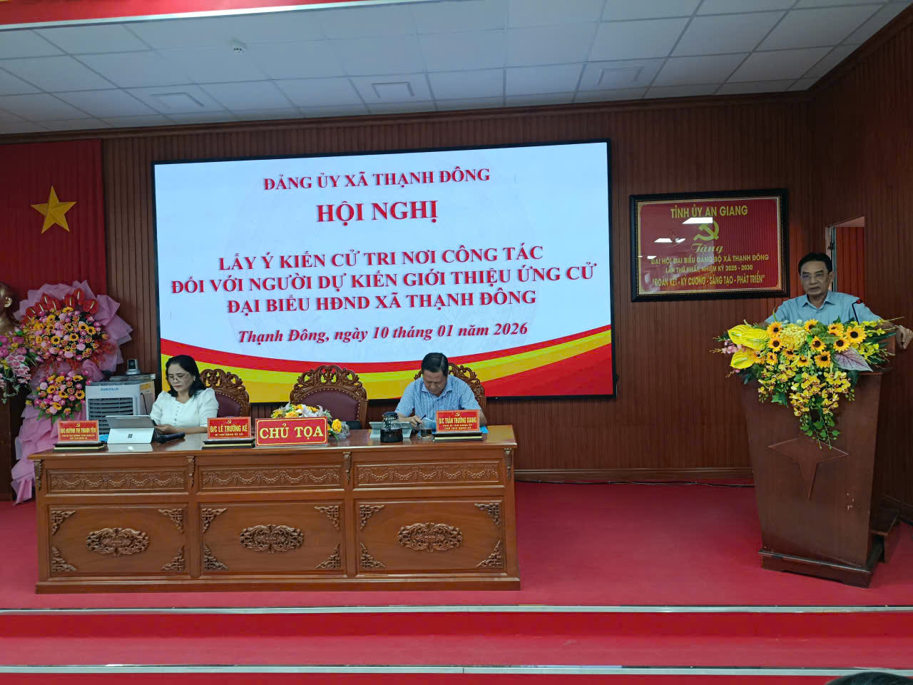 Sáng ngày 10/01/2026, tại hội trường UBND xã Thạnh Đông, Đảng ủy xã Thạnh Đông tổ chức Hội nghị lấy ý kiến cử tri nơi công tác đối với người ứng cử đại biểu Hội đồng nhân dân xã khóa II, nhiệm kỳ 2026 – 2031. Đây là hội nghị có ý nghĩa quan trọng, được tổ chức đúng quy trình, đảm bảo dân chủ, công khai, minh bạch theo quy định của pháp luật về bầu cử.