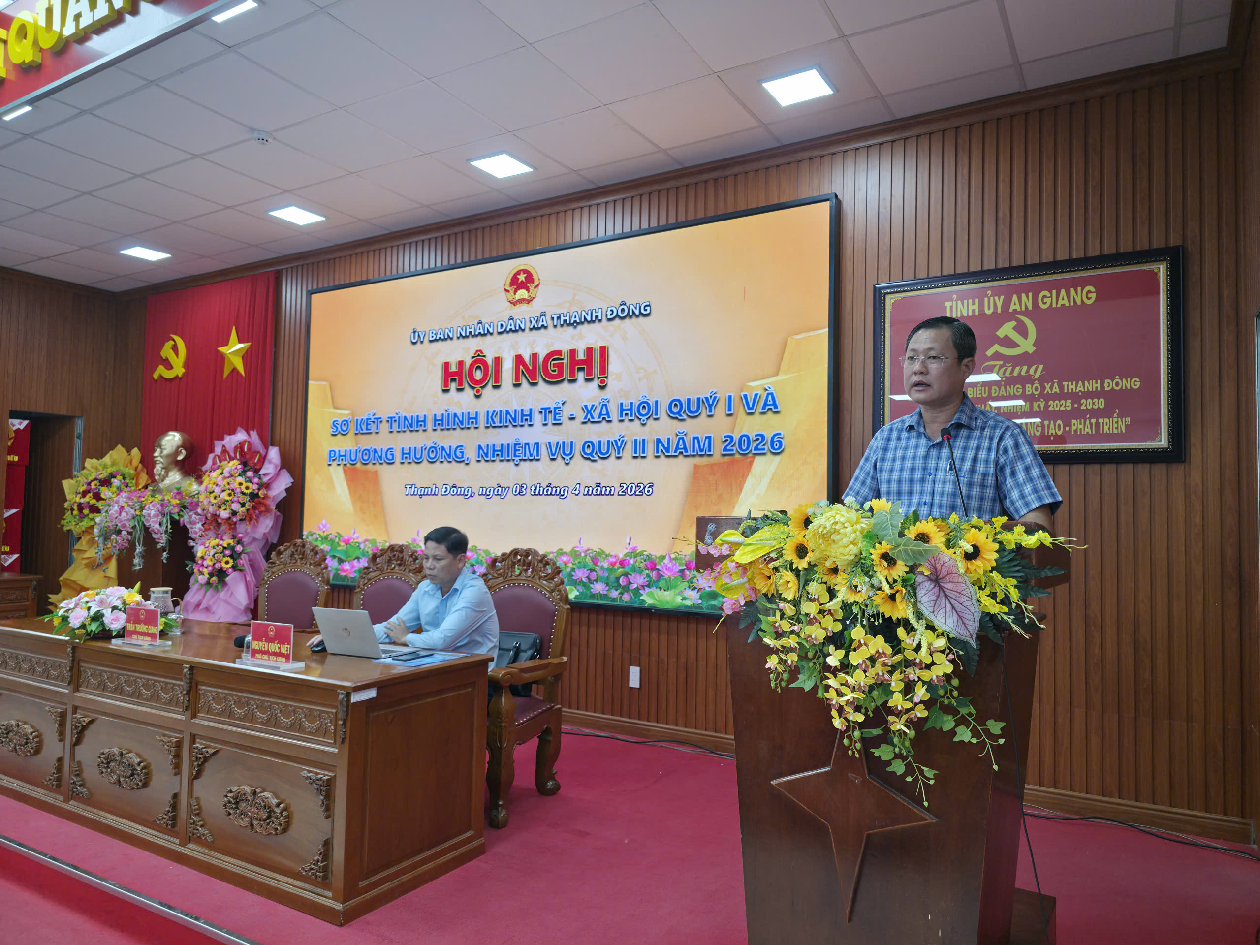 Ngày 03/4/2026, Ủy ban nhân dân xã Thạnh Đông tổ chức Hội nghị sơ kết tình hình thực hiện nhiệm vụ Quý I và triển khai nhiệm vụ trọng tâm tháng 4, Quý II năm 2026. Tham dự hội nghị có các đồng chí Thường trực Đảng ủy; đồng chí Chủ tịch và Phó Chủ tịch UBND xã; đồng chí Chủ tịch Ủy ban MTTQ Việt Nam xã; cùng lãnh đạo các cơ quan, đơn vị thuộc UBND xã; Hiệu trưởng các điểm trường và Trưởng ấp các ấp trên địa bàn.