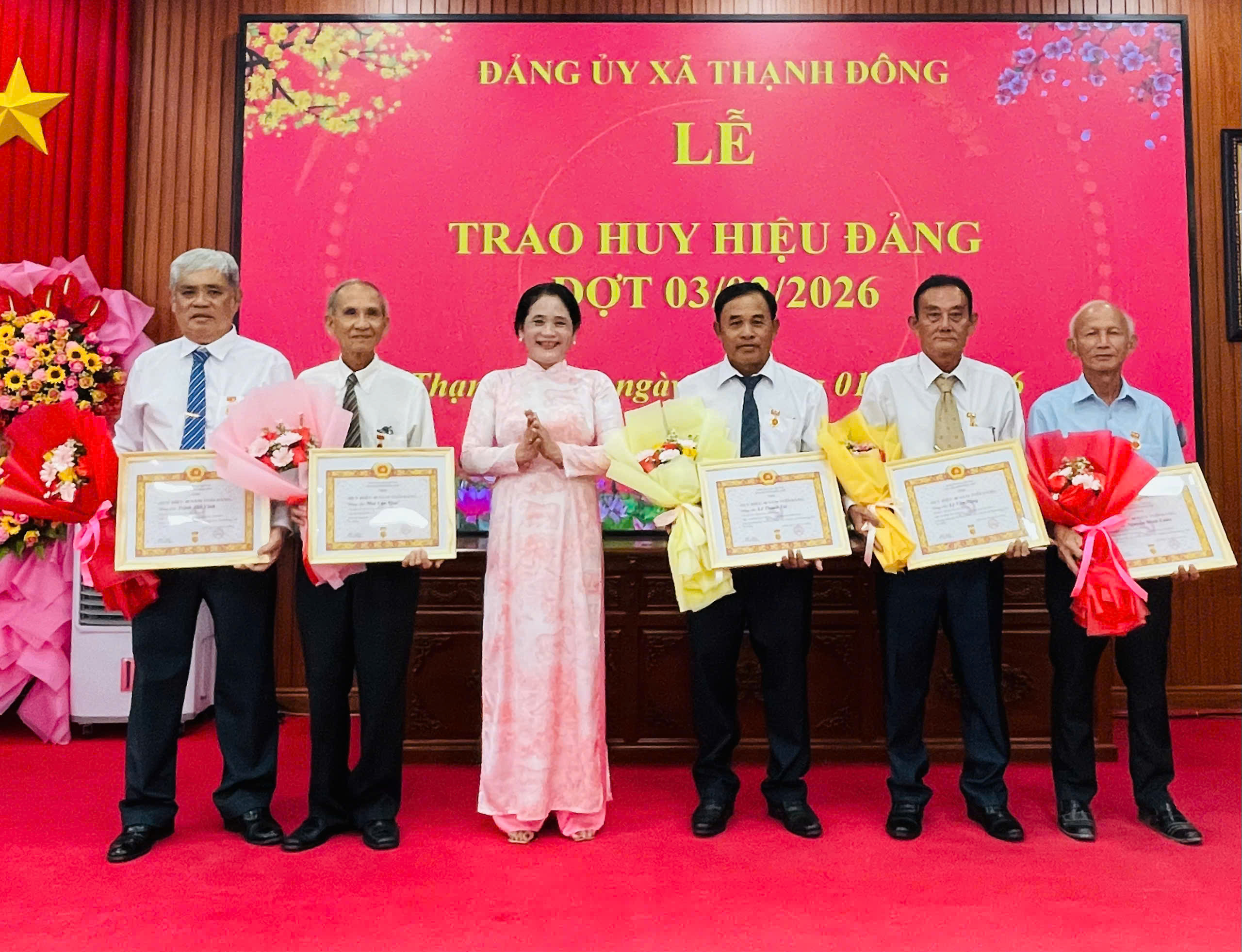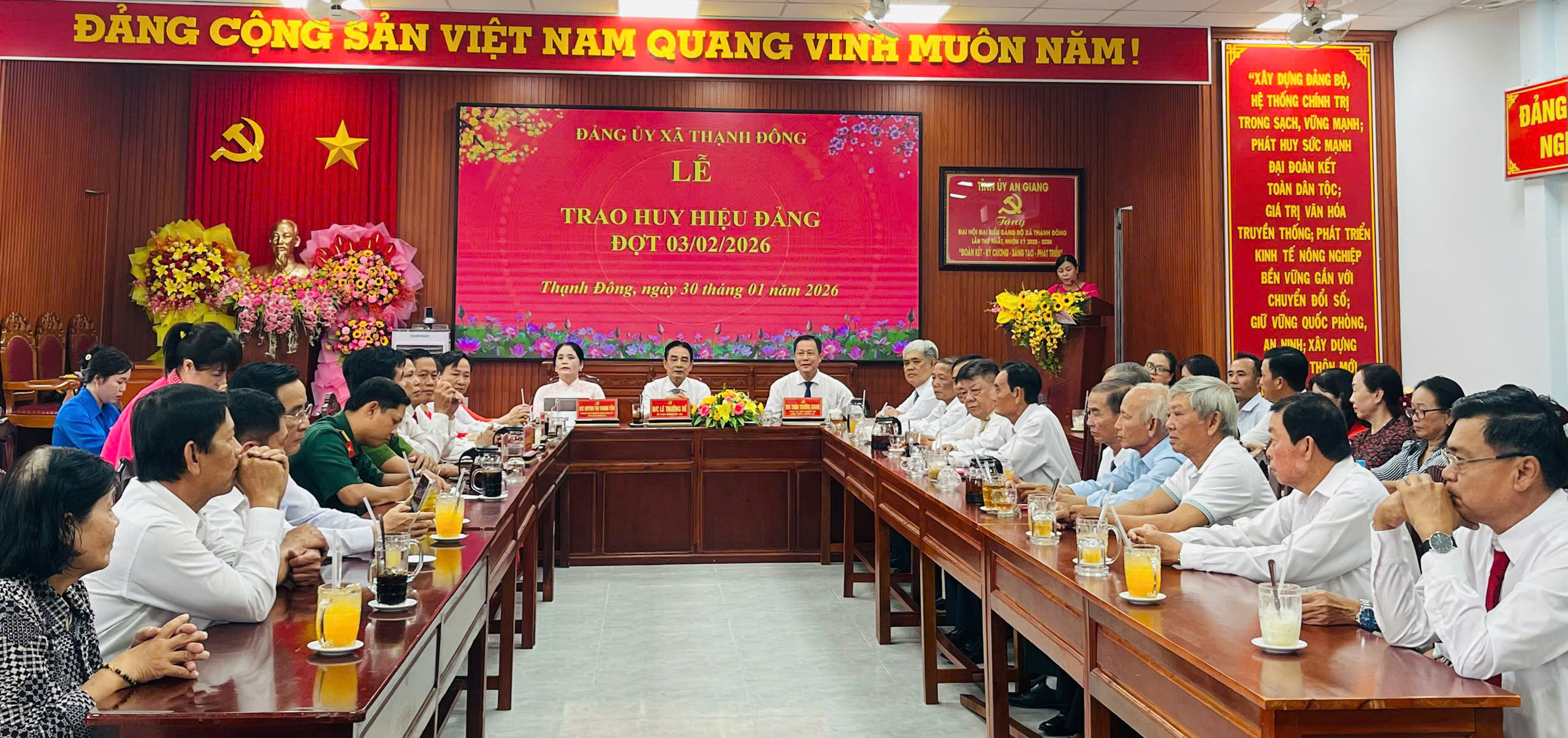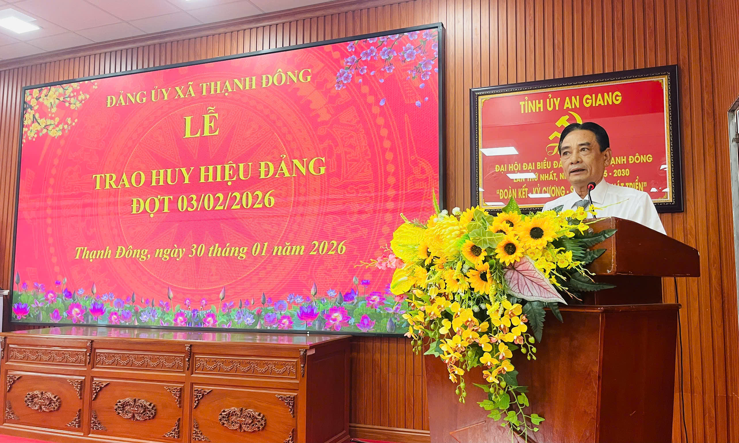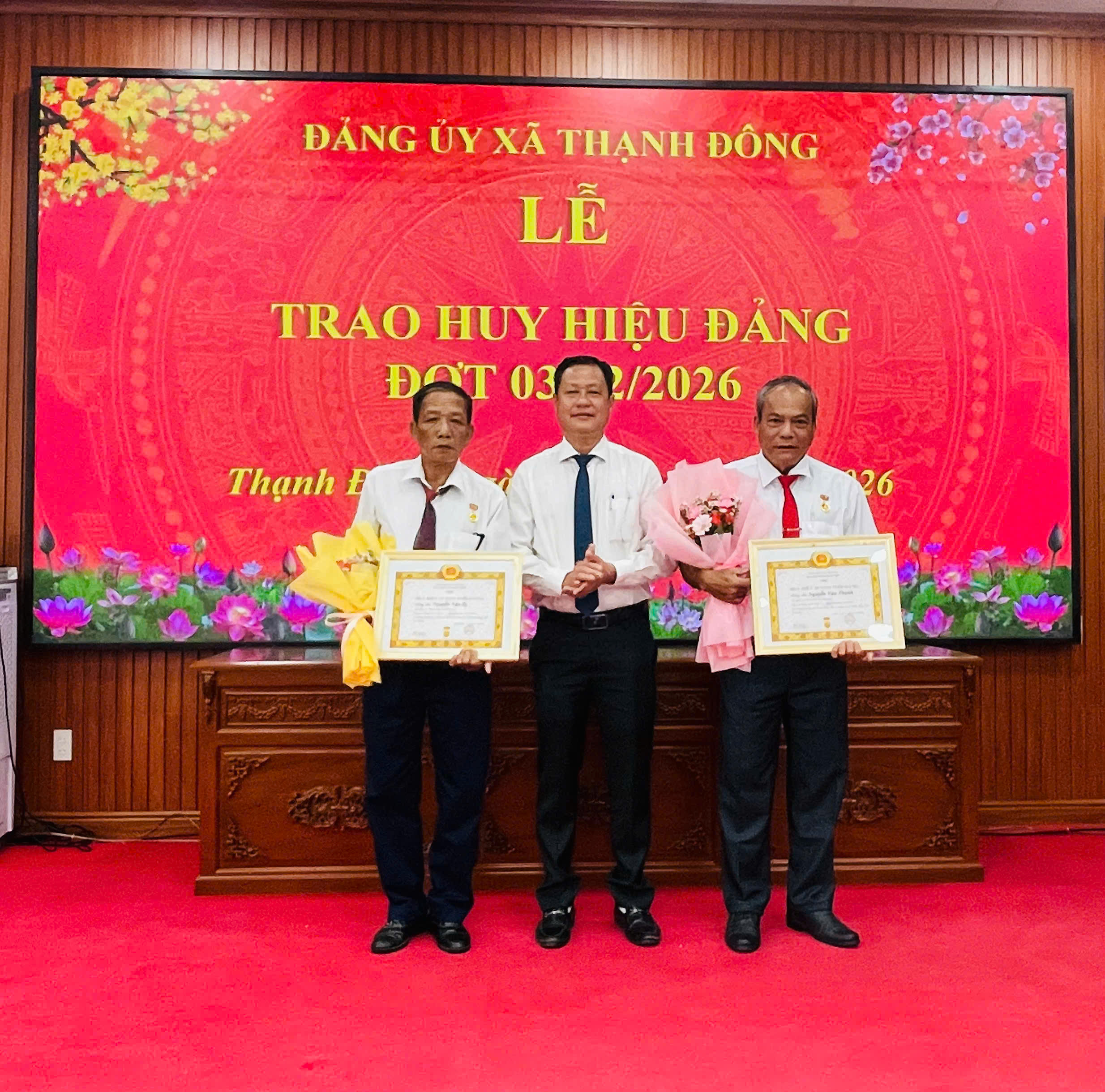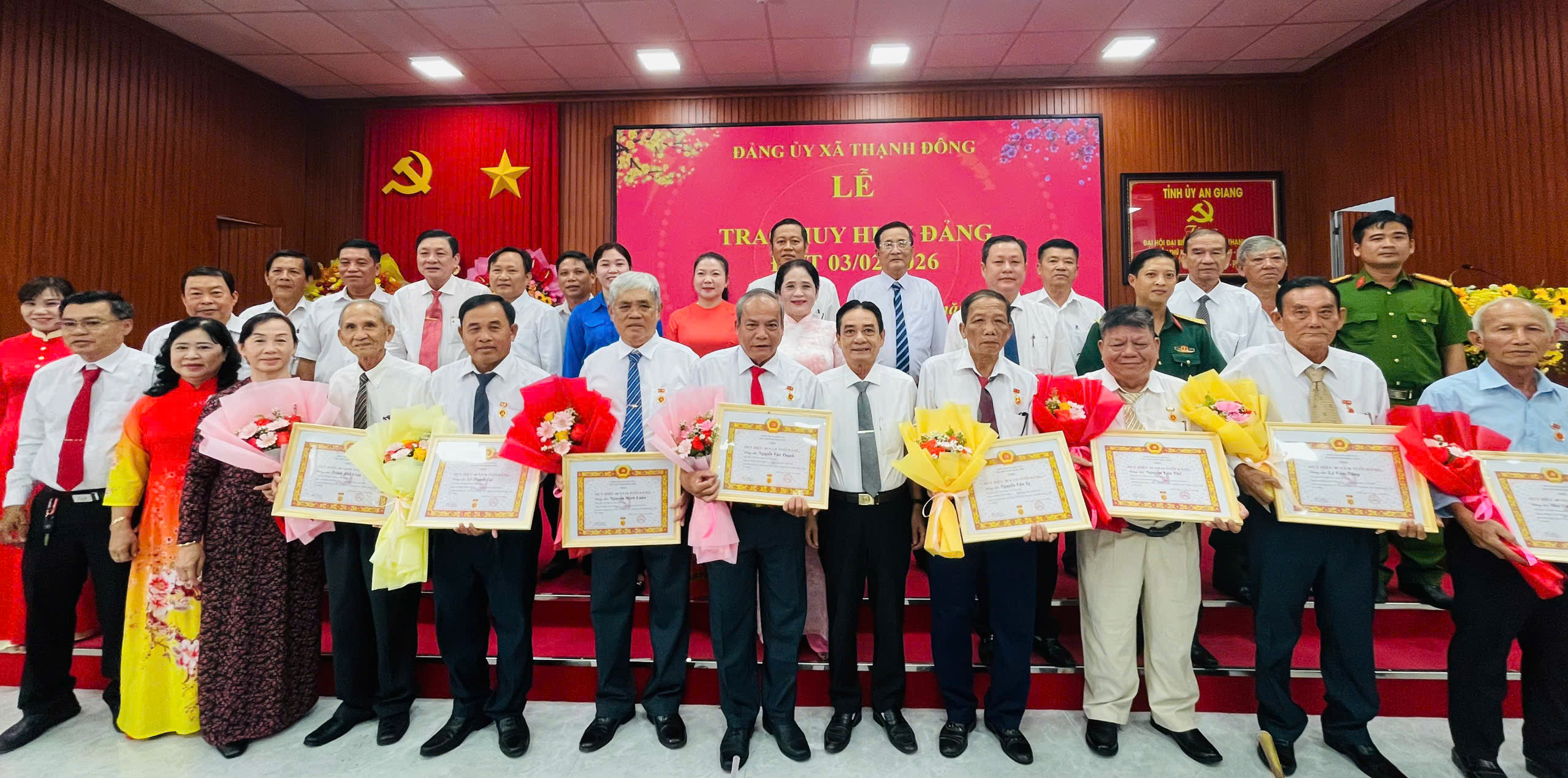 Sáng ngời truyền thống "Uống nước nhớ nguồn", chiều ngày 30/01/2026, Ban Thường vụ Đảng ủy xã Thạnh Đông long trọng tổ chức Lễ trao Huy hiệu Đảng đợt 03/02 gắn với họp mặt các đồng chí nguyên lãnh đạo Đảng ủy qua các thời kỳ nhân dịp Xuân Bính Ngọ 2026. Buổi Lễ vinh dự trao Huy hiệu Đảng cho 08 đồng chí cao niên tuổi đảng (trong đó 01 đồng chí đạt 50 năm tuổi Đảng; 05 đồng chí đạt 40 năm tuổi Đảng; 02 đồng chí đạt 30 năm tuổi Đảng). Đồng chí Lê Trường Kế, Bí thư Đảng ủy và các đồng chí thường trực Đảng ủy xã chủ trì buổi Lễ.
